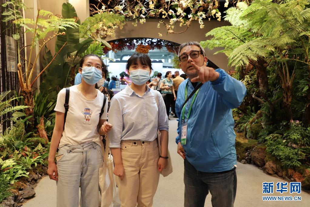 來(lái)自上海奉賢區(qū)的沈女士(中)成為室內(nèi)臺(tái)灣館第30萬(wàn)名觀眾,臺(tái)灣館館長(zhǎng)林惠義(右)親自為她導(dǎo)覽(6月18日攝)。