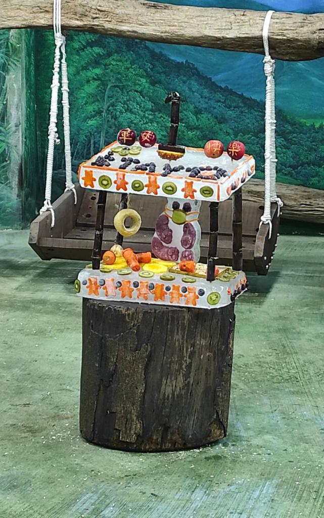 保育員精心設(shè)計(jì)了雙層冰塊蛋糕,上面有用蘋(píng)果雕刻的“平安快樂(lè)”四個(gè)字和用葡萄鋪成的“stay home”字樣。園方說(shuō),這些祝福也是希望眼下臺(tái)灣的新冠疫情早日結(jié)束,大家生活恢復(fù)正常。最上層的“1”字形甘蔗,象征周歲與愛(ài)的祝福。冰雕小熊置于中間并戴上奇異果雕花口罩,旁邊掛上窩窩頭做成的輪胎圈等“圓寶”喜歡的玩具,口罩與水果雕成的酒精噴罐是要提醒大家加強(qiáng)自我防疫。
