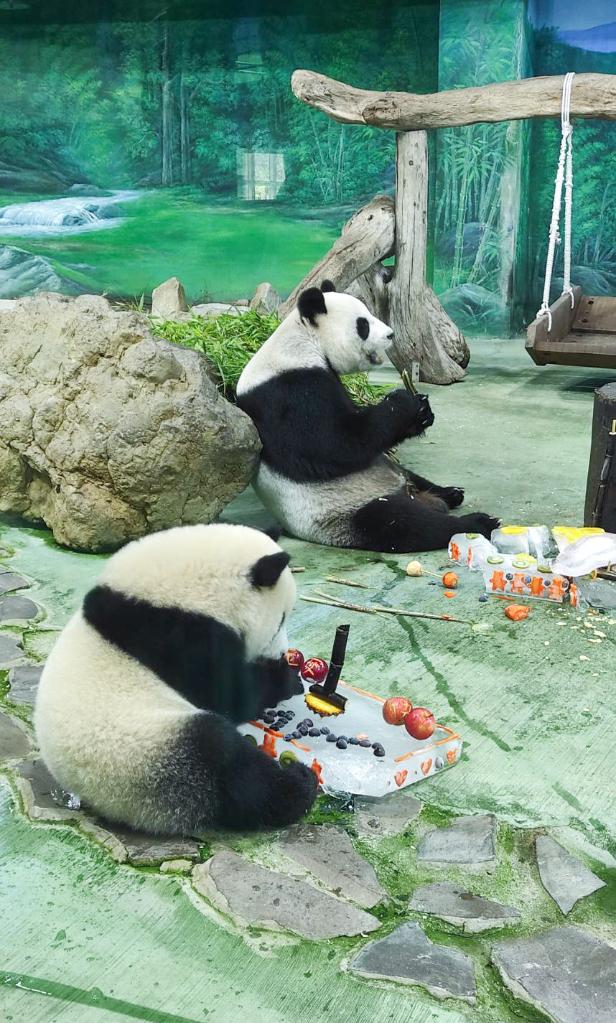 “圓寶”和媽媽“圓圓”一起享用蛋糕。圖片由臺(tái)北市立動(dòng)物園提供。