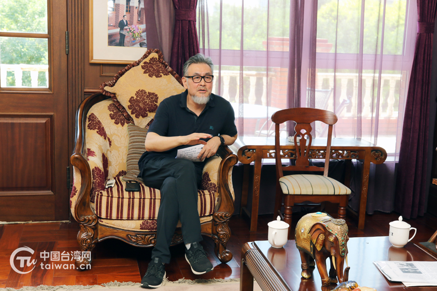 林獻(xiàn)堂后人、林獻(xiàn)堂抗日事跡陳列館館長(zhǎng)林義旻介紹林獻(xiàn)堂與梁?jiǎn)⒊煌墓适拢约案赣H林正亨的英雄事跡。(中國(guó)臺(tái)灣網(wǎng) 陳佳慧 攝)