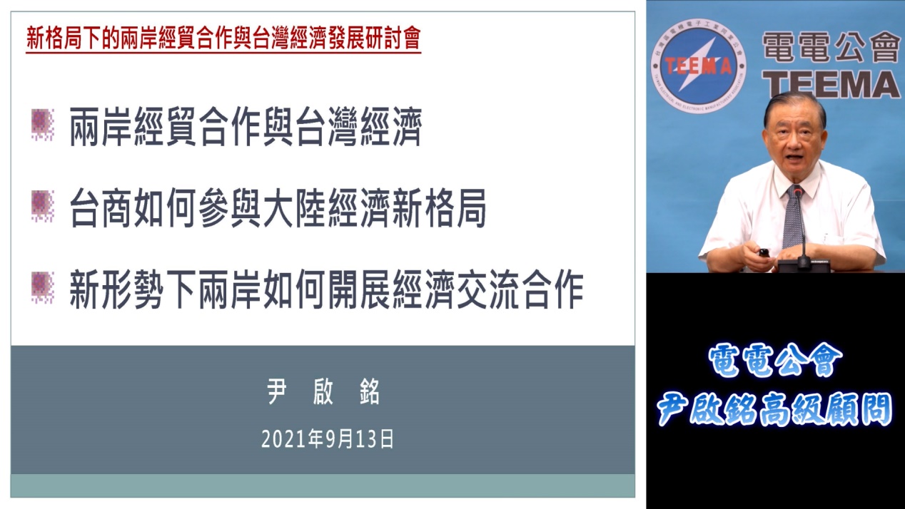 臺灣電機電子同業公會高級顧問尹啟銘通過視頻連線,參加“新格局下的兩岸經貿合作與臺灣經濟發展研討會”(圖片來源:視頻截圖)
