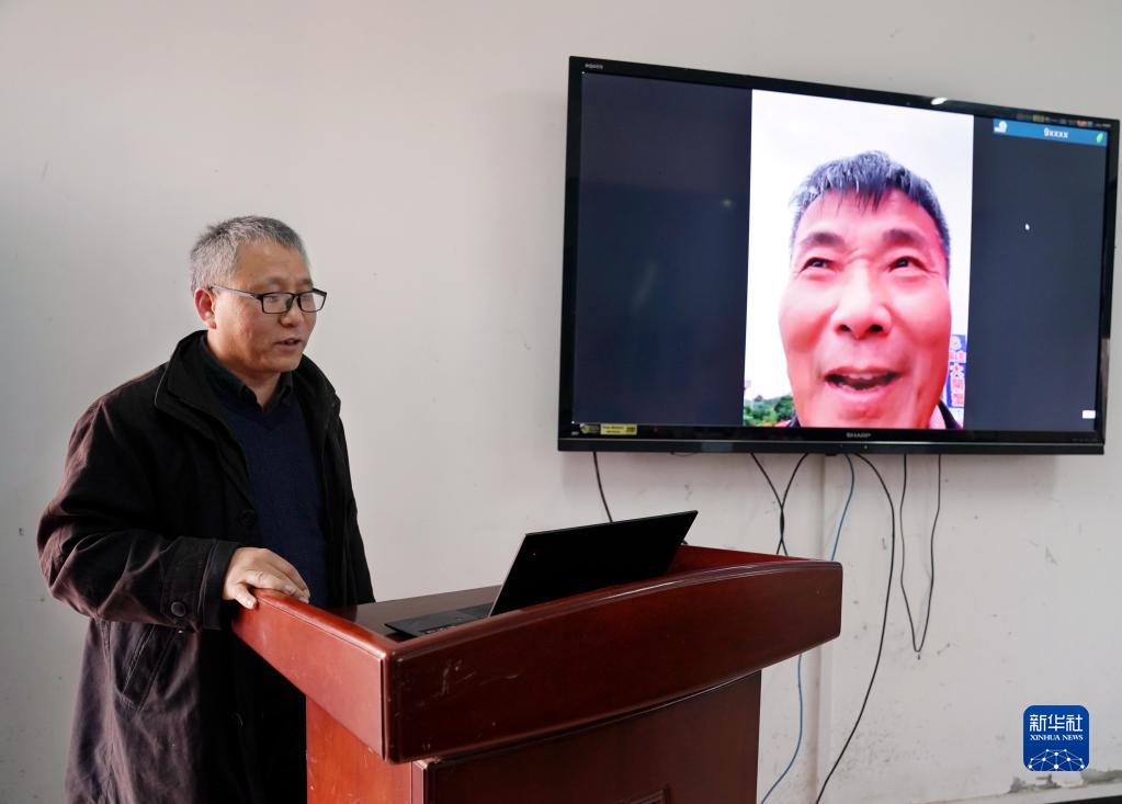 上海海洋大學成永旭教授連線苗栗縣蟹農代表,了解今年的銷售情況(11月25日攝)。新華社記者 劉穎 攝