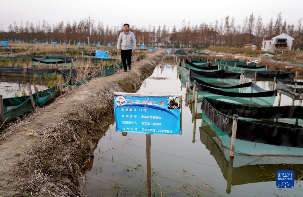 這是11月25日在上海海洋大學崇明基地拍攝的扣蟹實驗池塘。新華社記者 劉穎 攝