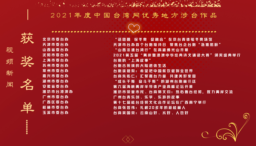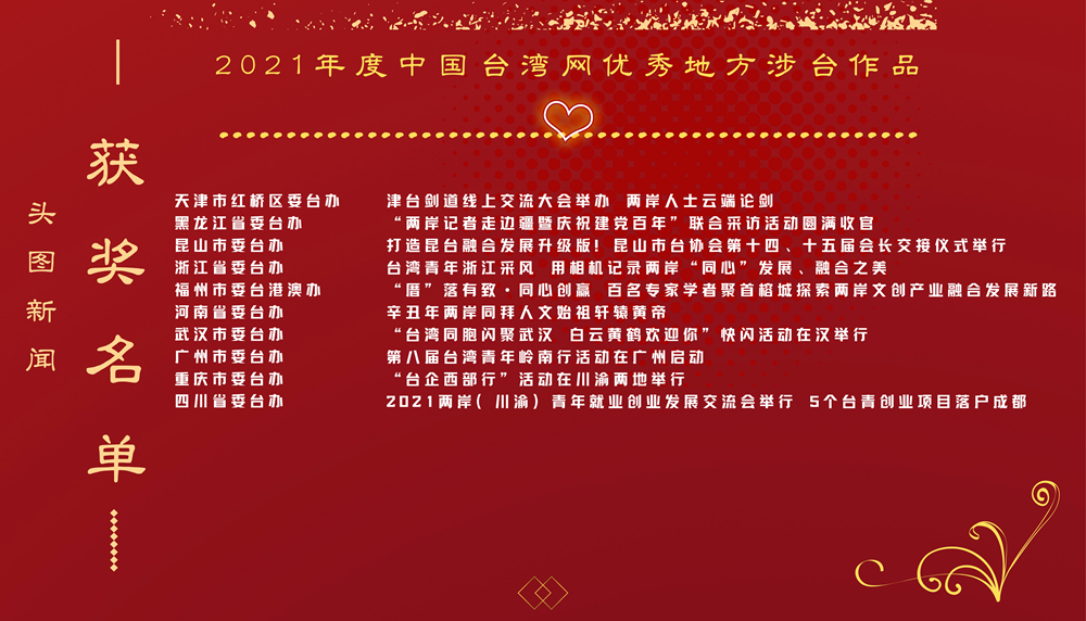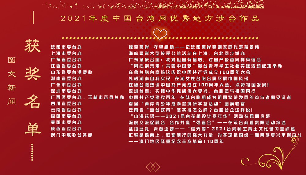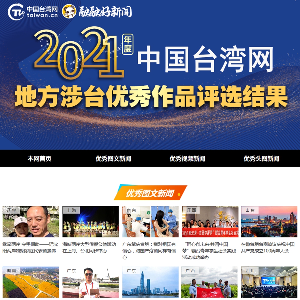中國臺(tái)灣網(wǎng)“2021年度地方涉臺(tái)優(yōu)秀作品”揭曉 深化兩岸交流成果匯聚民族復(fù)興力量
