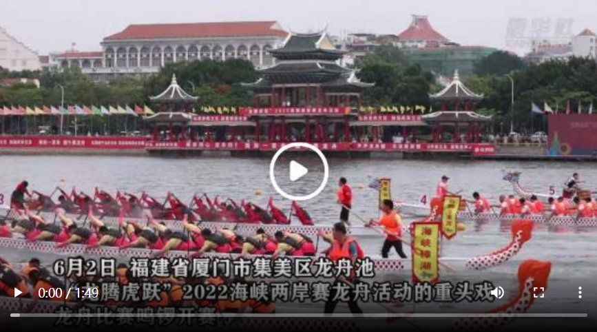62日,福建省廈門市集美區龍舟池,云旗獵獵,雷鼓嘈嘈。龍騰虎躍”2022海峽兩岸賽龍舟活動的重頭戲——龍舟比賽鳴鑼開賽!由在閩臺胞、臺商、臺青組成的17支臺胞隊伍,與24支大陸隊伍御龍逐浪,通過賽龍舟這項歷史悠久的中華傳統民俗活動,共同迎接端午佳節到來。