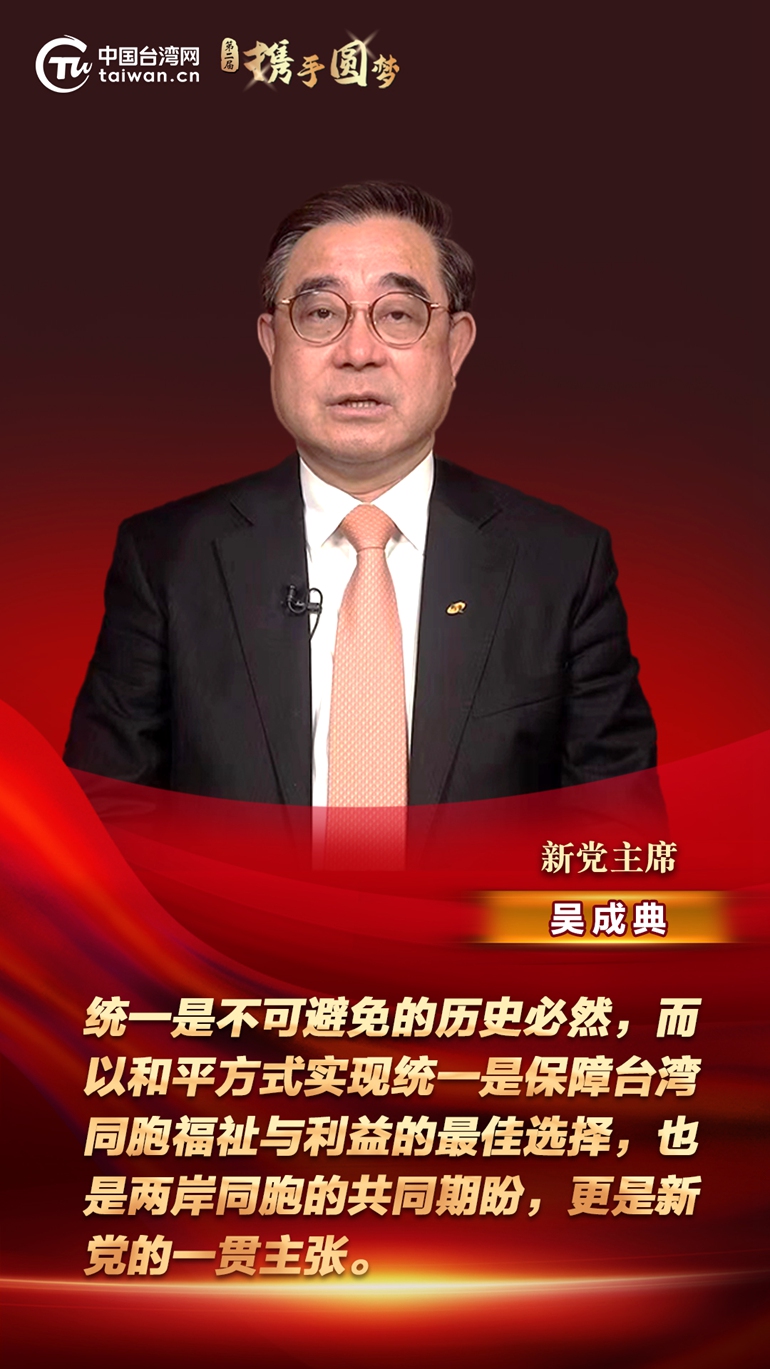 第二屆“攜手圓夢——兩岸同胞交流研討活動”7日在北京開幕。新黨主席吳成典通過視頻致辭時表示,統一是不可避免的歷史必然,而以和平方式實現統一是保障臺灣同胞福祉與利益的最佳選擇,也是兩岸同胞的共同期盼,更是新黨的一貫主張。