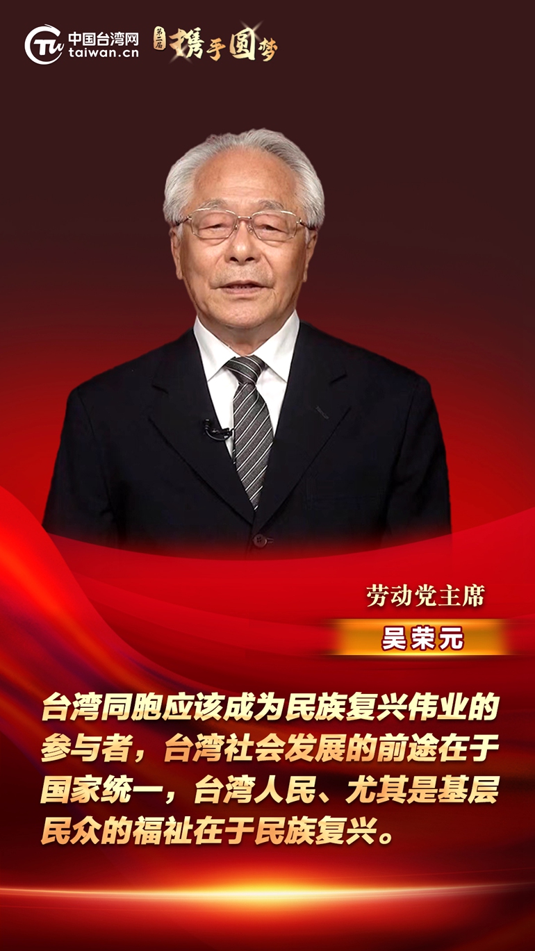 第二屆“攜手圓夢——兩岸同胞交流研討活動”7日在北京開幕。勞動黨主席吳榮元在視頻致辭時表示,臺灣同胞應該成為民族復興偉業的參與者,臺灣社會發展的前途在于國家統一,臺灣人民、尤其是基層民眾的福祉在于民族復興。