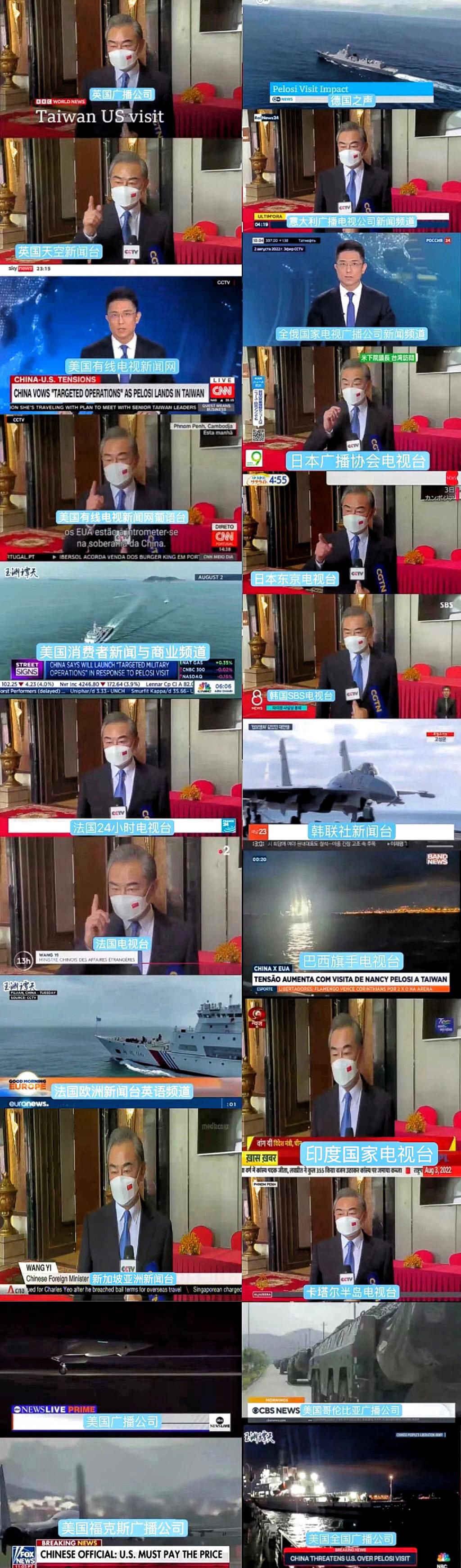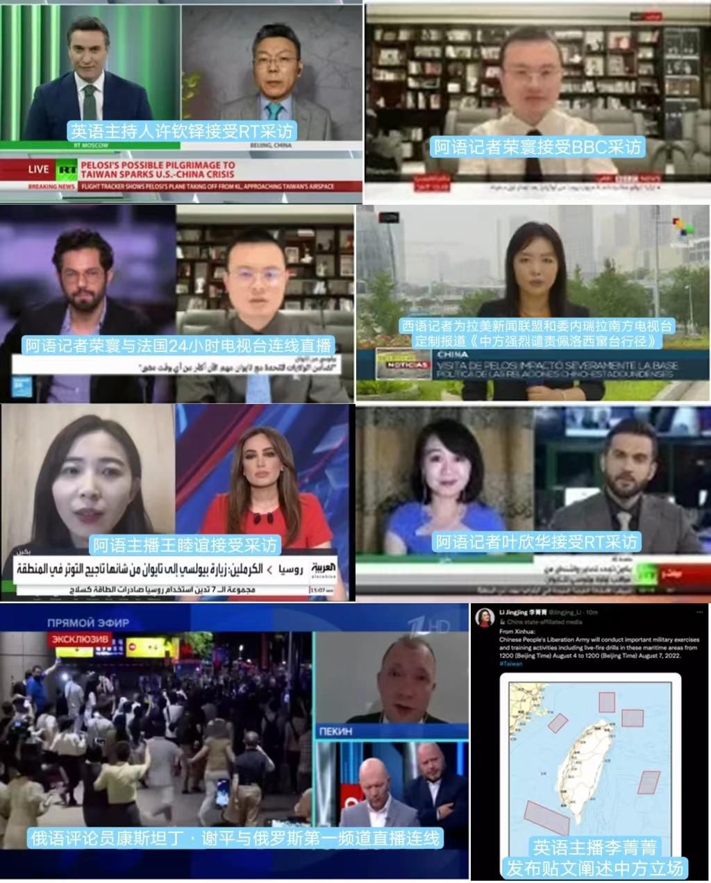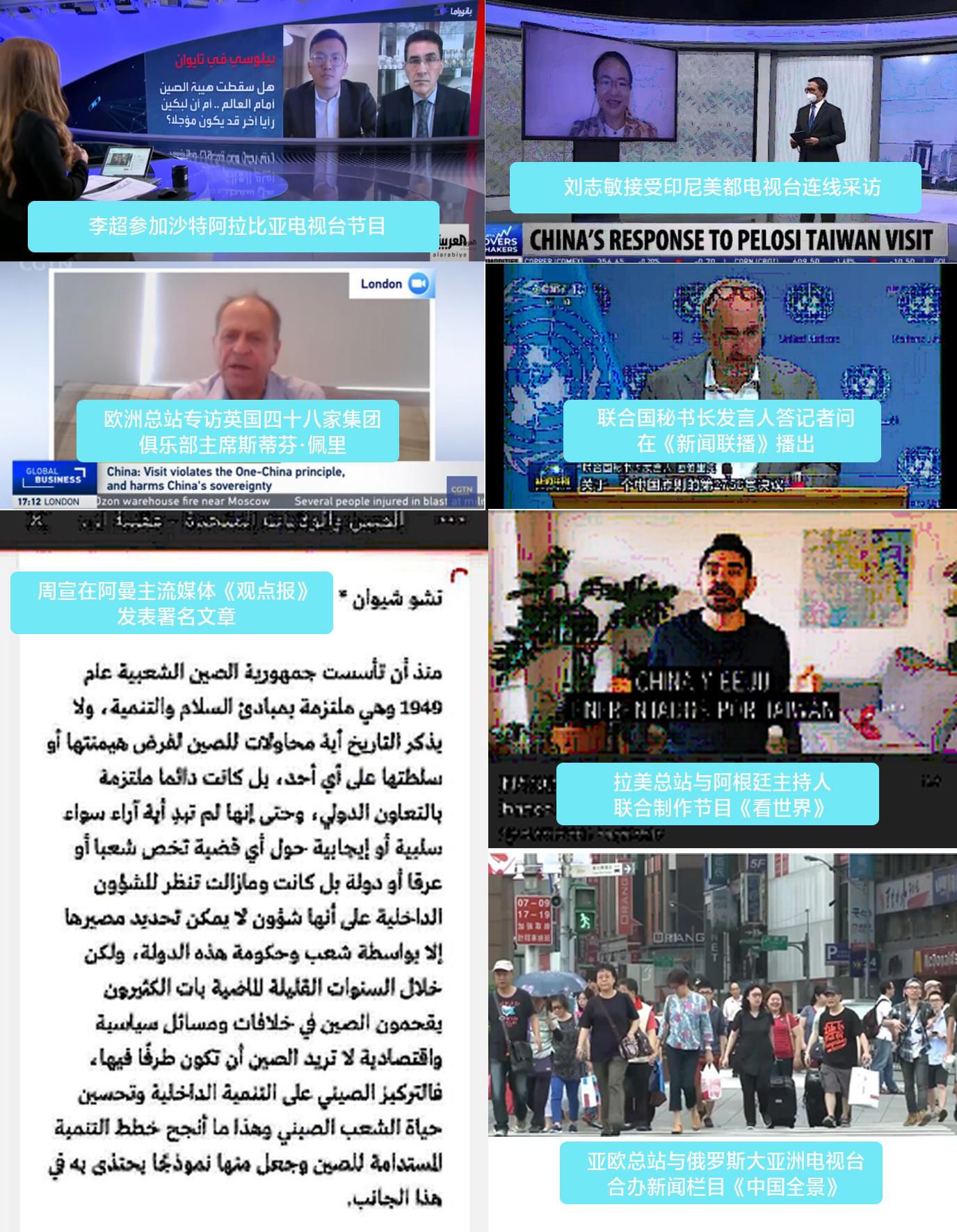 8月2日至4日,中東總站、亞太總站記者參加沙特阿拉比亞電視臺、沙特東方電視臺、沙特24電視臺、英國天空新聞臺阿拉伯語頻道、埃及明日電視臺、以色列24小時新聞頻道、印尼美都電視臺等當(dāng)?shù)刂髁髅襟w黃金時段節(jié)目,表達(dá)中方嚴(yán)正立場,詳細(xì)講述臺灣問題的歷史經(jīng)緯。