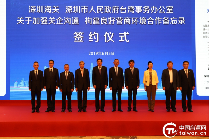 2019年6月,深圳海關與深圳臺辦簽訂《關于加強關企溝通 構建良好營商環境合作備忘錄》,兩岸企業家峰會大陸方面理事長郭金龍、臺灣方面副理事長邱正雄等出席簽約儀式。(中國臺灣網發)