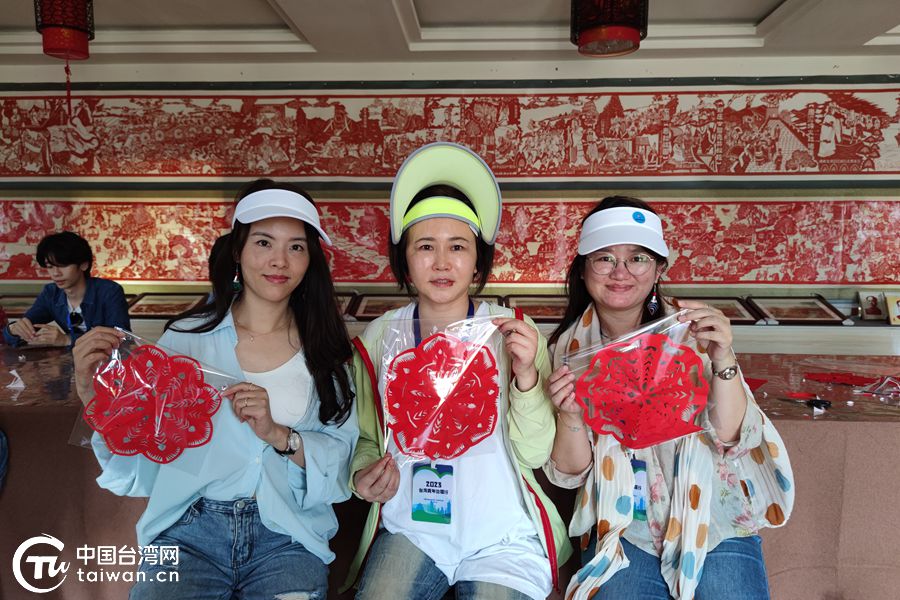 臺灣青年們整齊地坐在長桌兩旁,開始學習基礎(chǔ)剪紙工藝。手起剪刀落,趙阿姨一邊講、一邊剪,一張精致的紙花便映入眼簾。