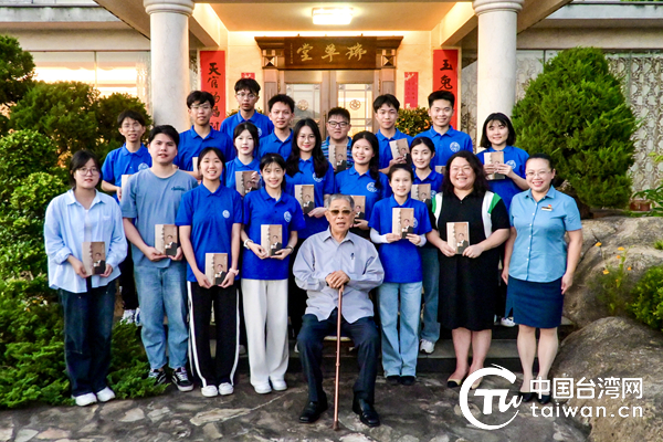 圖為漳州天福茶業(yè)有限公司創(chuàng)始人李瑞河先生為實踐隊成員贈書并合影留念。(中國臺灣網(wǎng)發(fā))