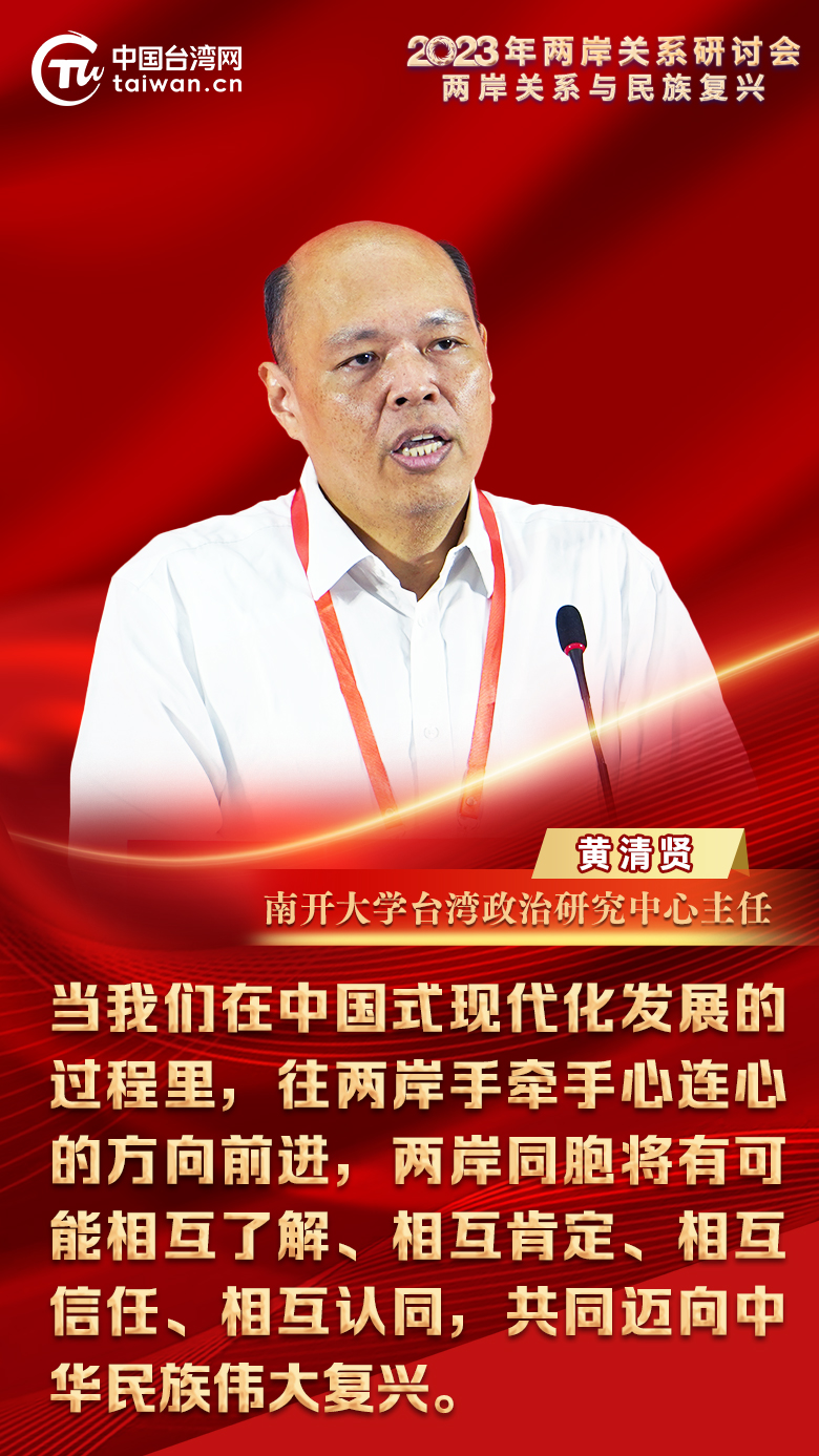 2023年兩岸關系研討會8月17日上午在四川成都開幕。南開大學臺灣政治研究中心主任黃清賢在活動上表示,當我們在中國式現代化發展的過程里,往兩岸手牽手心連心的方向前進,兩岸同胞將有可能相互了解、相互肯定、相互信任、相互認同,共同邁向中華民族偉大復興。
