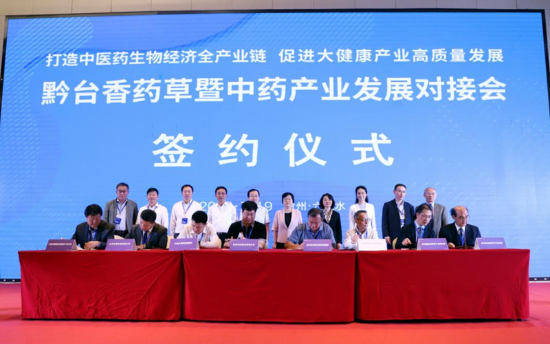 圖為7月19日舉行的“黔臺香藥草暨中藥產業發展對接會”簽約儀式現場,這是2023年“貴州·臺灣經貿交流合作懇談會”系列活動之一。