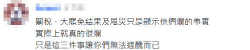 還有人一語道破:“關稅、大罷免結果及風災只是顯示他們爛的事實。實際上就真的很爛,只是這三件事讓你們無法遮丑而已”。