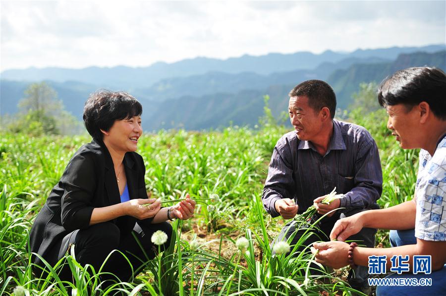 余留芬(左)在巖博村的韭菜地里與村民交流明年的種植計劃(10月9日攝) 。新華社記者 陶亮 攝