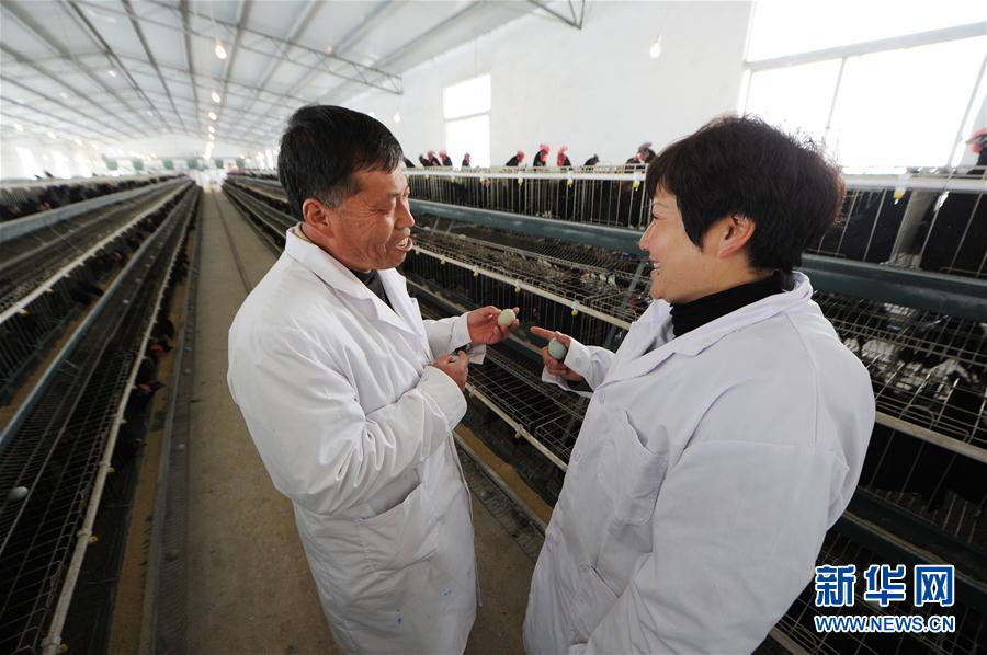 余留芬(右)在巖博村種雞養(yǎng)殖場向工作人員了解養(yǎng)殖場生產(chǎn)情況(2014年1月14日攝)。新華社記者 陶亮 攝