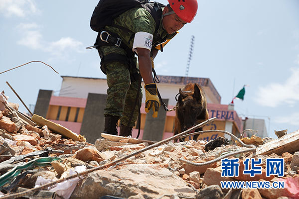 9月9日,在墨西哥瓦哈卡州胡奇坦,搜救人員和搜救犬在房屋廢墟上進行搜救。根據墨西哥政府發布的最新數據,截至9日晚,墨西哥地震遇難人數已上升至90人。墨西哥軍方和國防部開始向受災最嚴重的瓦哈卡州胡奇坦增派救援人員,為當地民眾提供人道援助。新華社記者淡航攝
