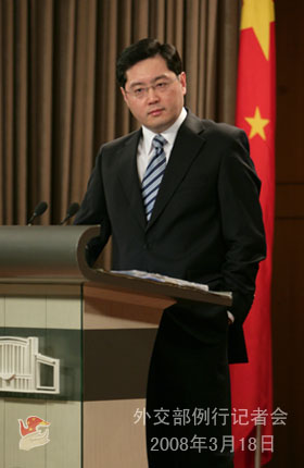 2008年3月18日下午,外交部發言人秦剛舉行例行記者會,就拉薩發生打砸搶燒嚴重暴力犯罪事件、朝鮮半島核問題等答記者問。