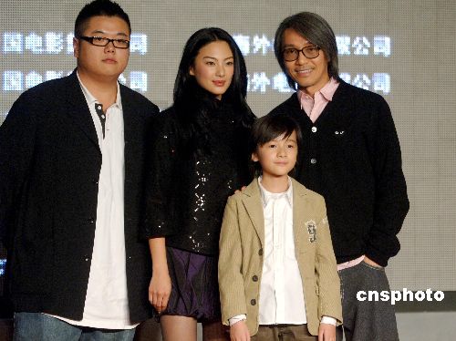 十一月二十二日,周星馳攜張雨綺(左二)、徐嬌(右二)、林子聰(左一)在北京出席其新片《長(zhǎng)江七號(hào)》的發(fā)布會(huì),他接受記者采訪時(shí)坦言這部電影是源自自己從小的一個(gè)夢(mèng)想,并曾真的見過(guò)兩次UFO。 中新社發(fā) 廖攀 攝