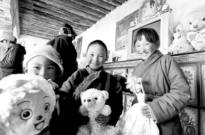 西藏拉薩市當雄縣納木湖鄉恰嘎村牧民達瓦次仁大女兒次珠(右)和妹妹在新房內展示玩具。新華社記者 格桑達瓦攝