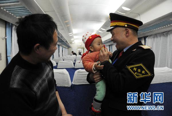 2月2日晚,列車長陶然抱起1歲2個月大的黃心怡,哄她早點入睡。農歷大年三十,是中國人全家團聚辭舊迎新的時刻,但依然有一些人因為工作等原因,不得不在旅途中度過除夕夜。2日晚,記者踏上由成都開往貴陽的K9517次列車,在列車上與返鄉的106名旅客和50名工作人員一同度過了一個難忘的年三十。與春節前列車滿員的情況相比,年三十可以算是春運開始后最輕松的一天,但列車長陶然卻并不輕松。從大學畢業開始,他已經在鐵路系統工作了18年,今年是他在列車上度過的第8個除夕夜。為了讓旅客們在列車上過好年,陶然和列車員們盡可能提供貼心周到的服務,并給大家送上了新年小禮物和節日的問候。陶然告訴記者:“只要列車上還有一名乘客,我們都沒有輕松的時候。‘回家’是這列火車上每個人都期盼的事情,我們要讓旅客在歸途中感受到家的氛圍”。新華社記者 陳誠 攝