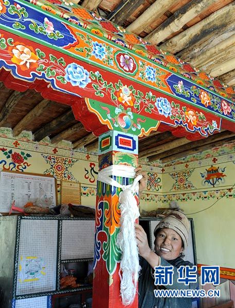 2月9日,西藏堆龍德慶縣古榮鄉農民巴桑卓瑪給自家新房柱子系上象征吉祥的哈達。