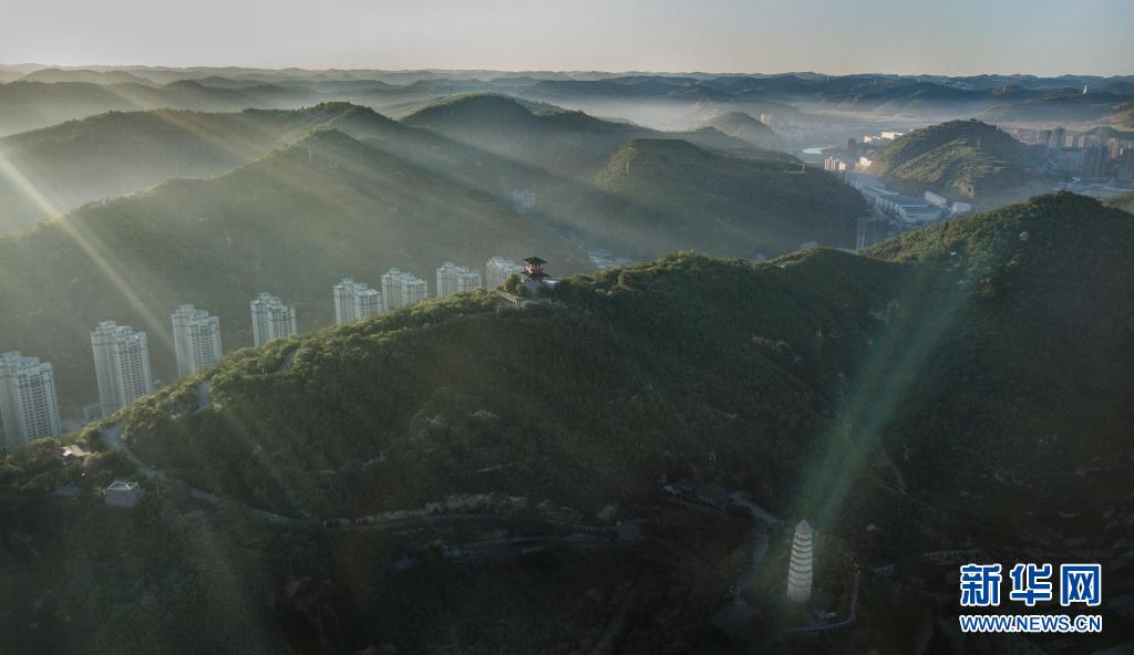 這是2019年8月29日拍攝的被綠色環繞的陜西省延安市寶塔山(無人機照片)。新華社記者 陶明 攝