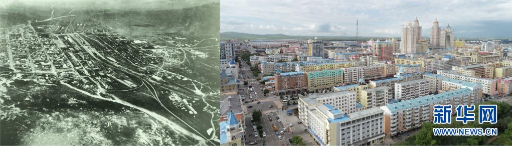 這是一張拼版照片,左圖為20世紀(jì)30年代滿洲里的航拍圖片;右圖為2020年8月26日拍攝的滿洲里城區(qū)(達(dá)日罕攝,無人機(jī)照片)。新華社發(fā)