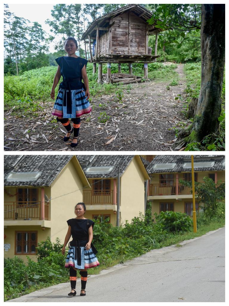 拼版照片:上圖為貴州黔南布依族苗族自治州荔波縣瑤山瑤族鄉村民謝三英從舊居的小路旁經過,下圖為謝三英從瑤山瑤族鄉拉片移民新村的公路旁經過(2017年8月8日攝)。新華社記者歐東衢攝