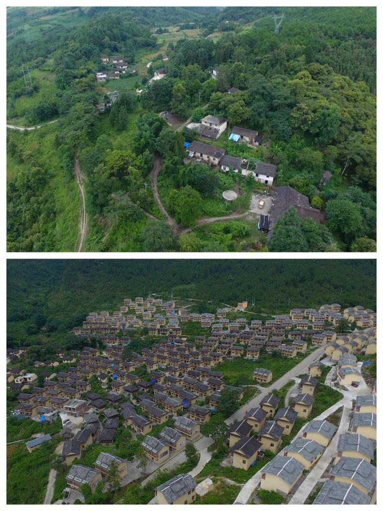 拼版照片:上圖為貴州省荔波縣瑤山瑤族鄉村民此前居住的拉片村林場組全景,下圖為瑤山瑤族鄉拉片移民新村全景(2017年8月8日攝)。新華社記者歐東衢攝