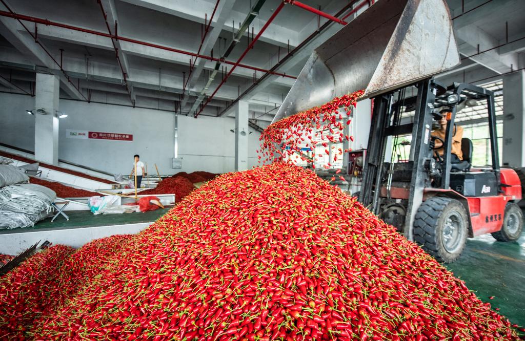 工人在遵義市新蒲新區一家辣椒加工企業內轉運辣椒(2020年8月13日攝)。新華社記者陶亮攝