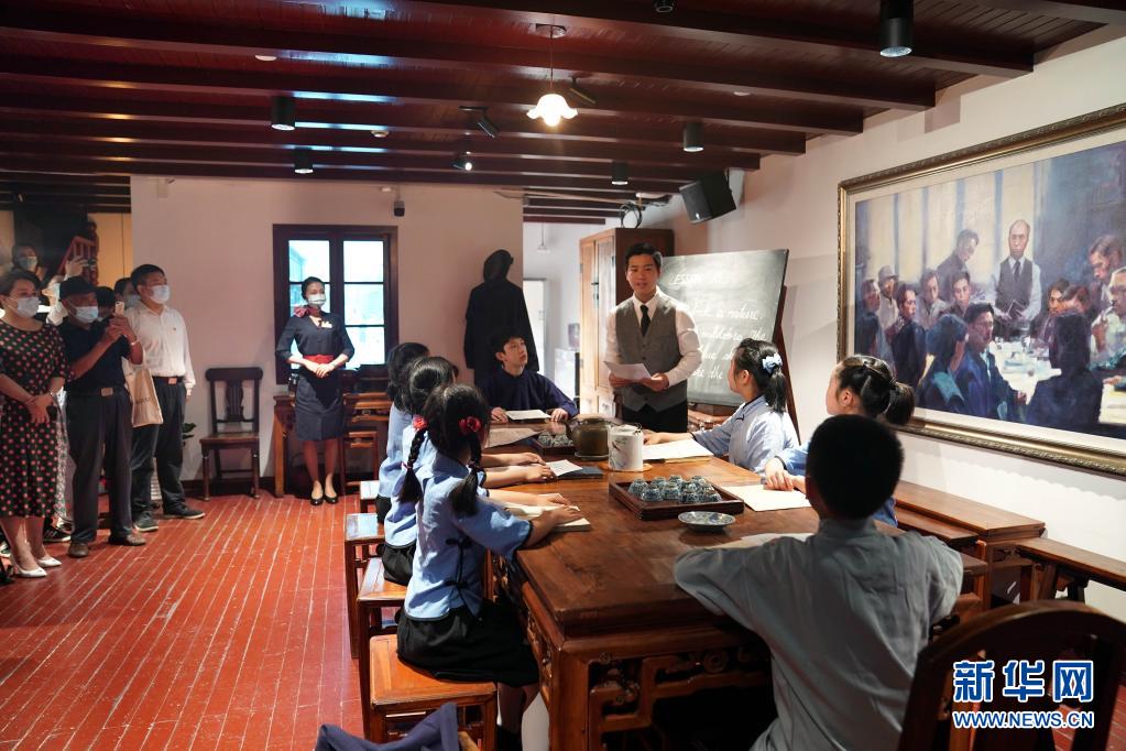 5月31日,中共四大紀(jì)念館“小紅花”小小講解員在場景再現(xiàn)廳演出情景劇。新華社記者 劉穎 攝