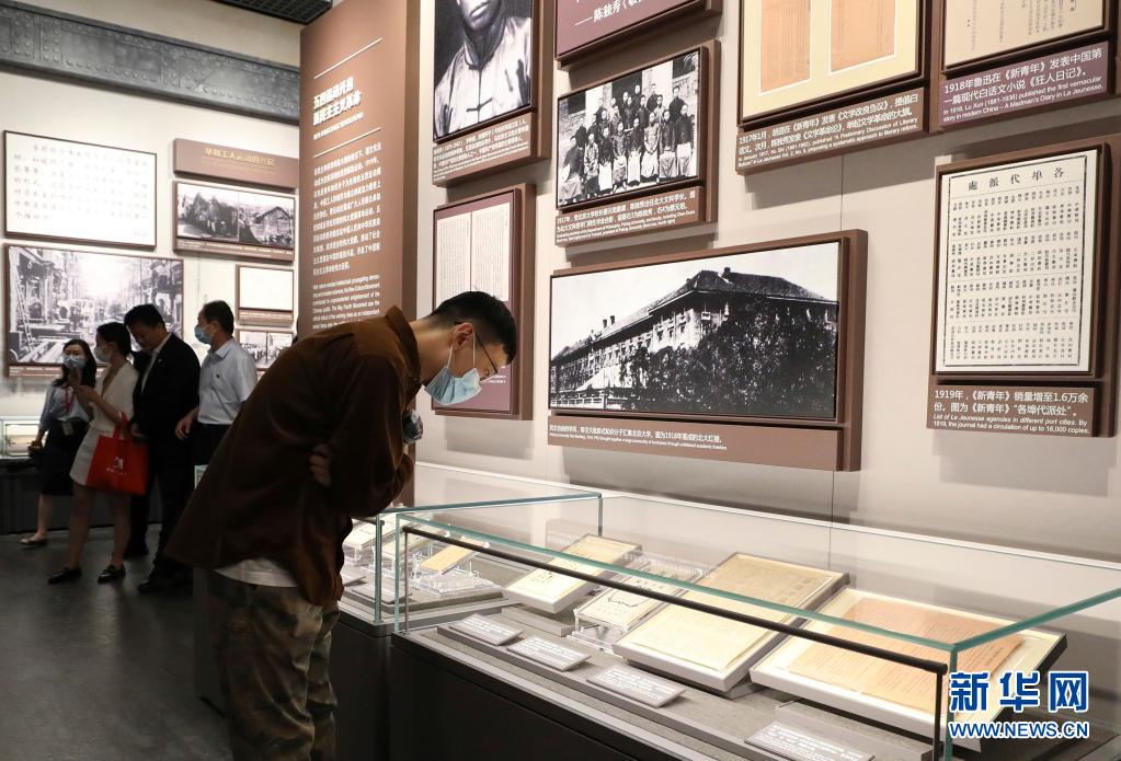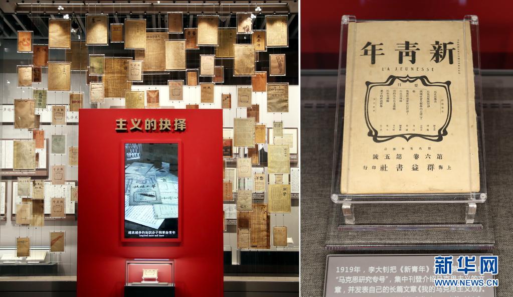 大型立體式視覺置景名為“主義的抉擇”,100件五四運動前后傳播馬克思主義、社會主義的報紙雜志,錯落陳列在玻璃墻上。其中,《新青年》第6卷第5號“馬克思研究專號”在前端“高光”展示,這期“專號”標志著馬克思主義在中國的傳播進入了較為系統的階段(6月1日攝)。新華社記者 劉穎 攝