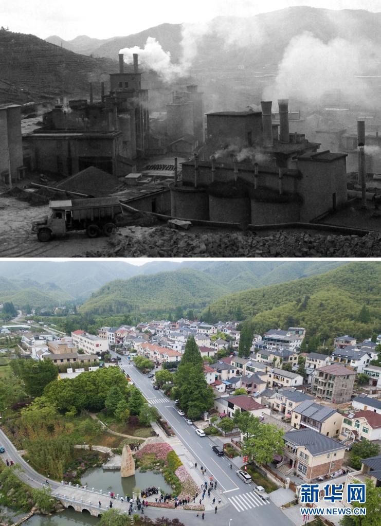 拼版照片:上圖為浙江省湖州市安吉縣天荒坪鎮(zhèn)余村上世紀(jì)八十年代的資料照片;下圖為2018年4月24日,游客在整修一新的余村游覽拍照(新華社記者翁忻旸攝)。新華社發(fā)