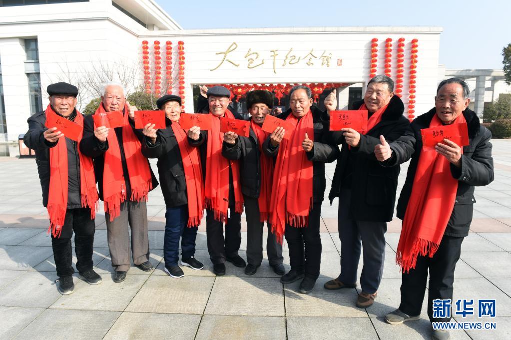 2月3日,在安徽省滁州市鳳陽縣小崗村,8位“大包干”帶頭人在大包干紀(jì)念館前展示自家領(lǐng)取的集體經(jīng)濟收益股權(quán)分紅。新華社記者 周牧 攝