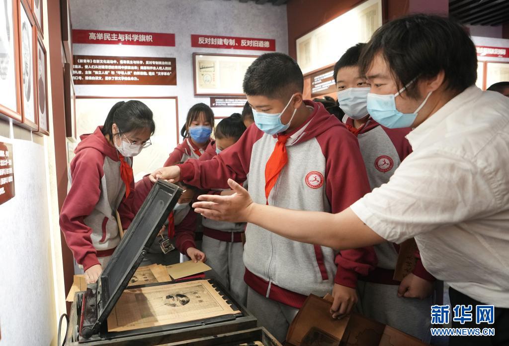 6月1日,北京市第二十七中學(xué)學(xué)生在《新青年》編輯部舊址(陳獨(dú)秀舊居)了解展出的油印機(jī)。新華社記者 鞠煥宗 攝
