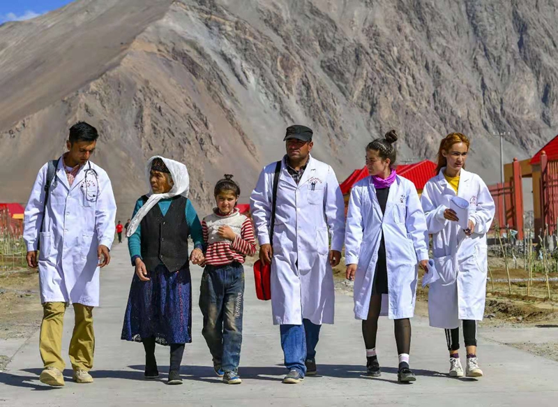 新疆塔什庫(kù)爾干塔吉克自治縣達(dá)布達(dá)爾鄉(xiāng)熱斯喀木村村醫(yī)發(fā)爾亞特·塔西白克(右三)與醫(yī)務(wù)人員來(lái)到當(dāng)?shù)匾椎胤鲐毎徇w安置點(diǎn)出診。隨著醫(yī)療扶貧的推進(jìn),新疆牧區(qū)的醫(yī)療條件和水平大幅提升,牧民享受到越來(lái)越多、越來(lái)越便利的醫(yī)療惠民服務(wù)。新華社記者 胡虎虎/攝