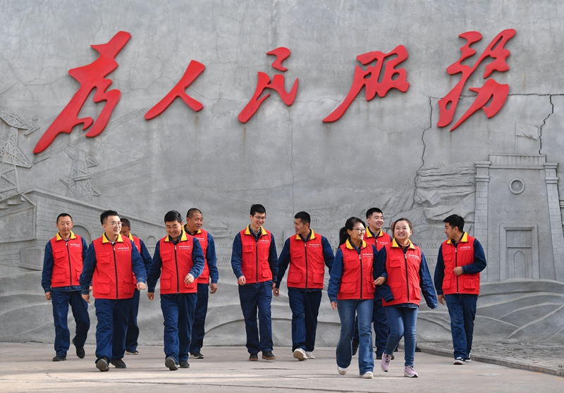 為人民服務(wù)!熠熠生輝的“紅色講臺(tái)”。2021年3月30日,國(guó)網(wǎng)延安供電公司棗園供電所張思德服務(wù)隊(duì)隊(duì)員結(jié)束集體學(xué)習(xí)活動(dòng)后走向工作崗位。新華社記者 張博文/攝