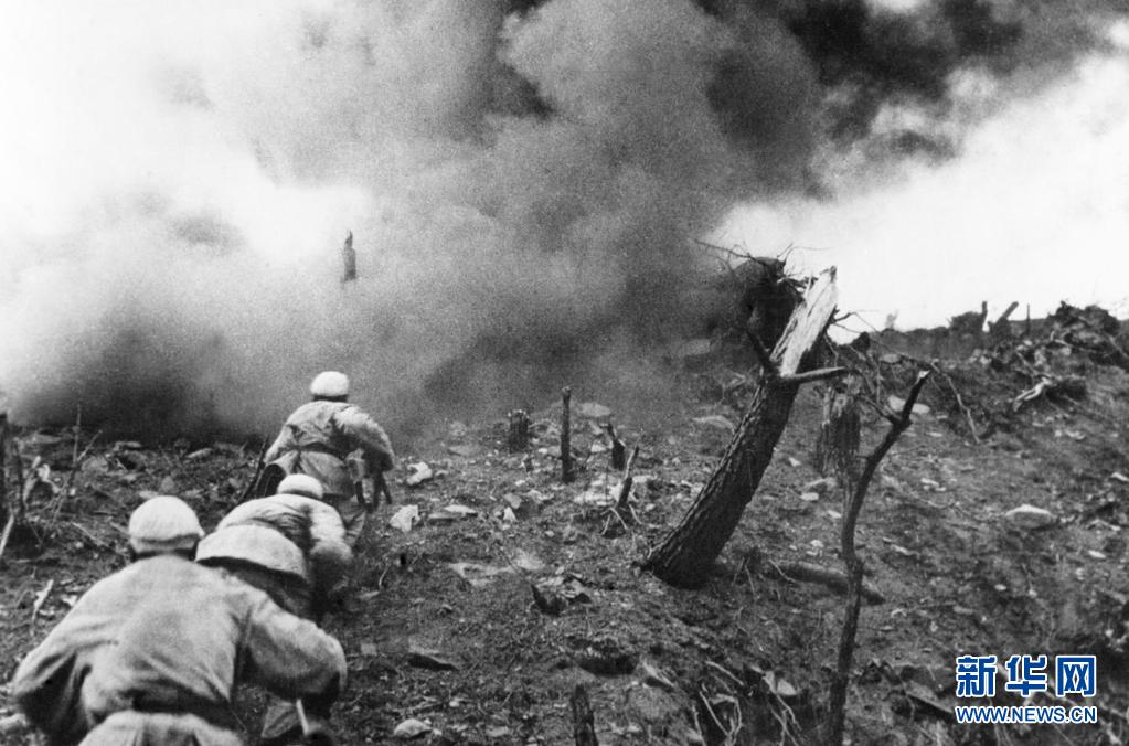 1952年,在上甘嶺戰役中,中國人民志愿軍指戰員在炮火支援下,攻上537.7高地北山。新華社發