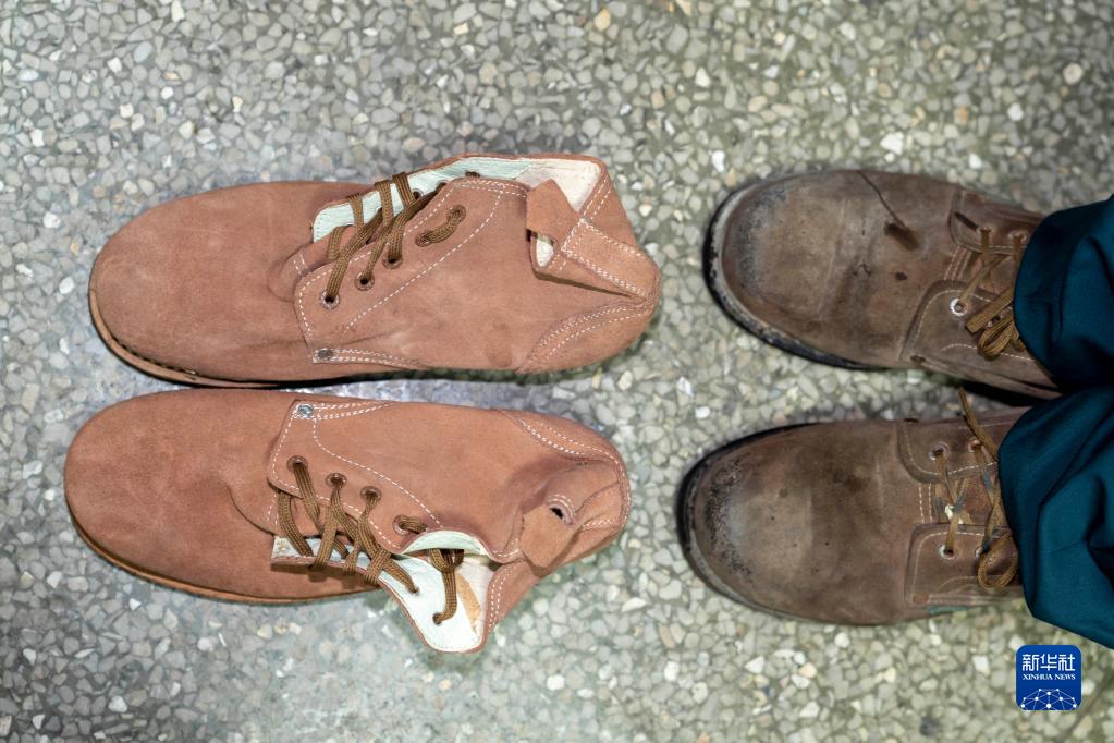 這是2021年2月27日拍攝的勞保鞋對比圖:左為全新的鞋,右為柴閃閃穿舊的鞋。新華社記者 王翔 攝