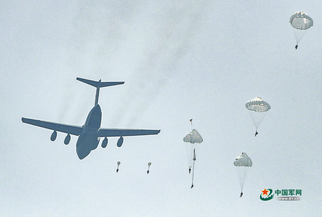 “跳!跳!跳!”離機信號響起,特戰隊員接連躍出機艙,朵朵傘花在空中競相綻放。安全著陸后,他們迅即投入戰斗行動之中。與此同時,擔任藍軍的某合成旅三營在預定地點展開防御,一場激烈對抗隨即上演。
