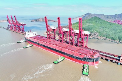 2月10日,浙江省舟山市岱山縣鼠浪湖碼頭,船只完成全卸作業(yè)后離港。姚峰攝/光明圖片