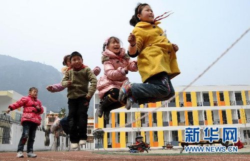 汶川縣映秀小學(xué)的曾國露(右一)與同學(xué)們在操場上玩耍(4月1日攝)。據(jù)了解,新的映秀小學(xué)在鋼筋混凝土的基礎(chǔ)上,還增加橡膠隔震支座、消能減震器和輕型隔斷,足以抗擊破壞力為9度的地震。 (新華社記者 陳凱 攝)