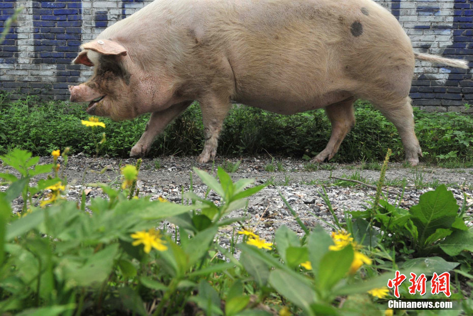 5月8日,四川省大邑建川博物館護養的“5.12汶川大地震”著名抗震動物豬堅強,目前為腿部后遺傷病動過手術后,正在專設的動物醫療所度過休養半年的病假生活之中。圖為豬堅強“踏春賞青”。(賈國榮 攝)