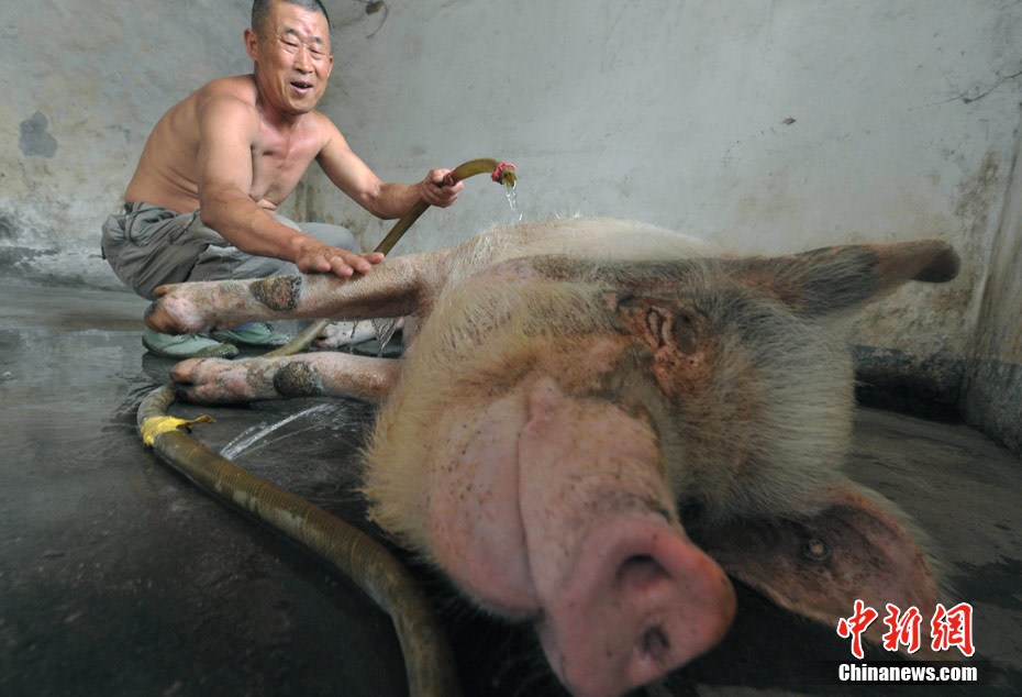 四川建川博物館館長樊建川特意將其收養,取名豬堅強,請它在博物館由王福清專人照顧度過余生。現在豬堅強已長到四百多斤重,每天散步減肥,準備盡可能在“5.12汶川大地震”三周年紀念期間與民眾名人們見面。圖為豬堅強洗澡潔身。(賈國榮 攝)