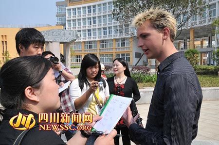 4月25日上午,“全國網絡媒體重返災區看奇跡”大型采訪報道團的記者們在智慧園區遇到了22歲的德國小伙保羅,保羅目前在青川職業高中支教英語課程。雖然來四川只有8周,但是保羅已經對青川產生了感情。“地震的時候我從新聞中了解了很多情況,看了很多圖片,知道四川受到的破壞很大。但是沒想到三年的時間這里就發生了這么大的變化,到處是新建的房子和學校,你們真的了不起,我很感動。”
