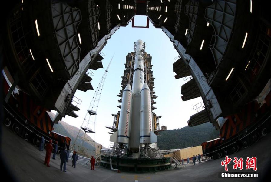 12月1日下午5時30分,勤務(wù)塔開始移離,做好發(fā)射準備。中新社發(fā) 秦憲安 攝