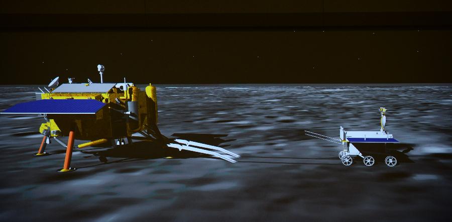 這是在北京飛控中心大屏幕上拍攝到“嫦娥三號”著陸器巡視器成功分離的模擬畫面。 12月15日4時35分,“嫦娥三號”著陸器巡視器成功分離。 新華社記者 李鑫 攝