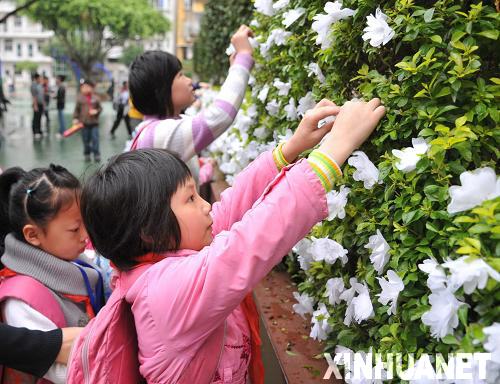 3月24日,福建省南平市實驗小學的學生上課前一一在校園內的綠籬上系上小白花,以寄托對8名遇害同學的哀思。