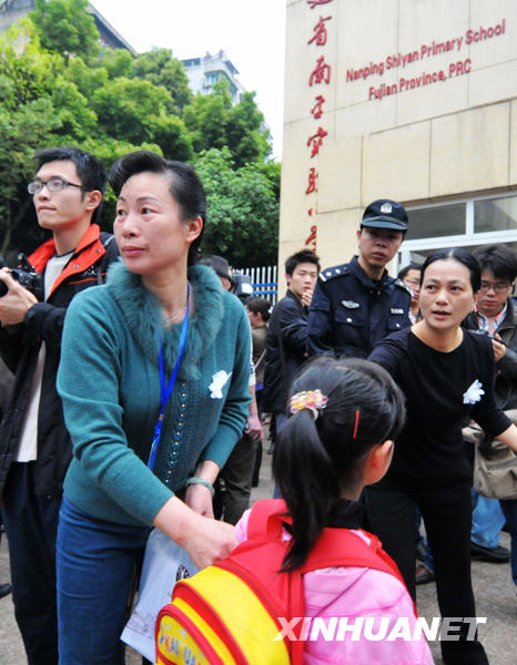 7時30分,南平市實驗小學的全體老師身著黑衣,胸佩白花,和警察一起排成人墻,站在校門外迎接經過一日一夜身心折磨的孩子們。
